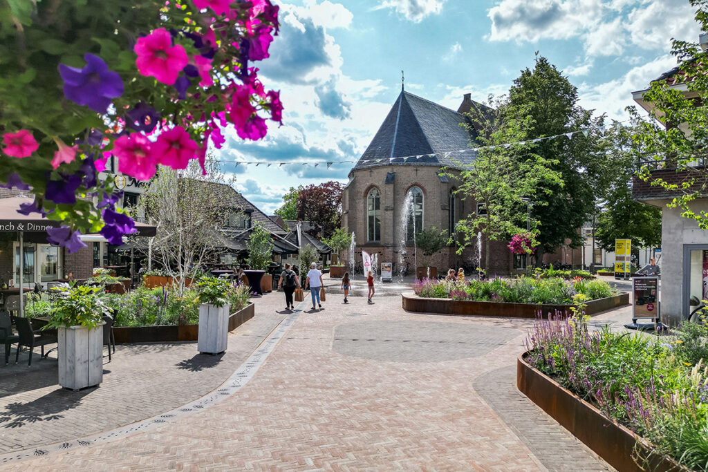 In het Nederlandse Raalte werd het stadscentrum heraangelegd met een geïntegreerd waterbeheersysteem van ACO. Een cortenstalen rooster begeleidt het regenwater visueel en functioneel over het plein. Ondergronds wordt het water gezuiverd en gebufferd. Slimme sensoren meten de bodemvochtigheid en activeren irrigatie enkel wanneer nodig. Zo blijft het groen gezond, ook tijdens lange droogteperiodes.